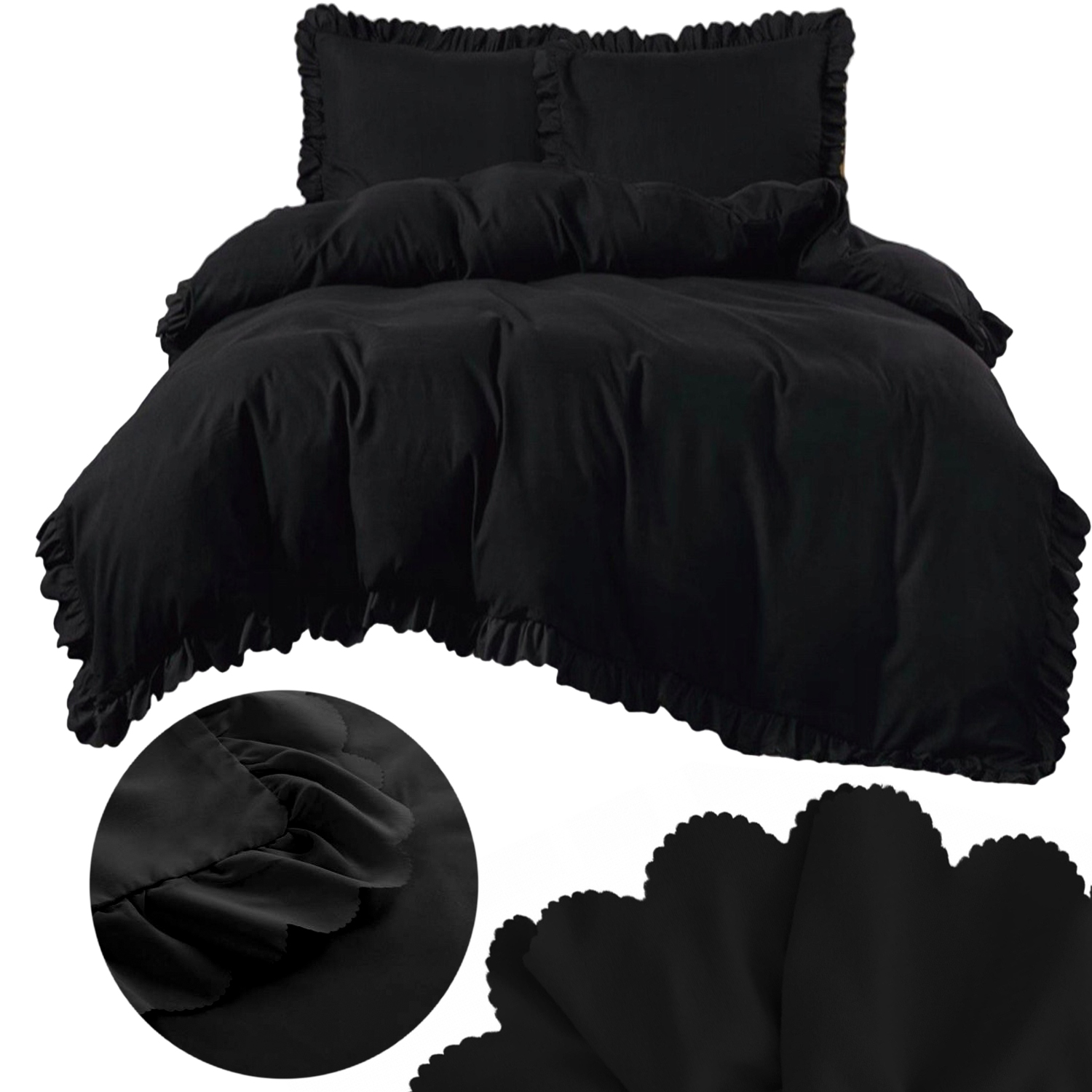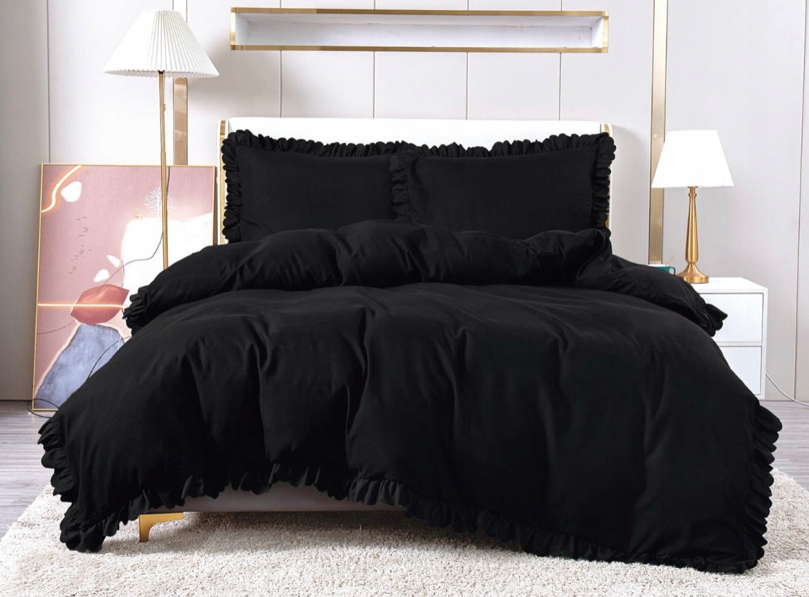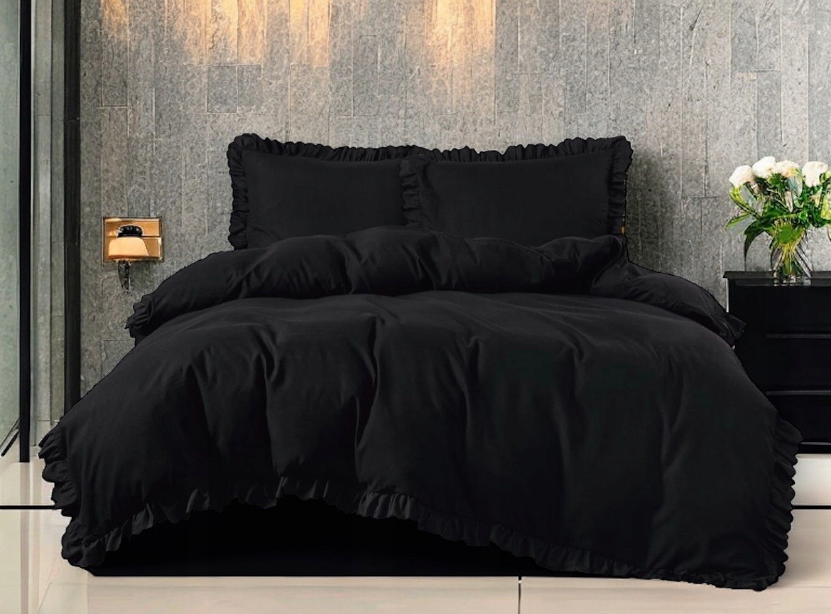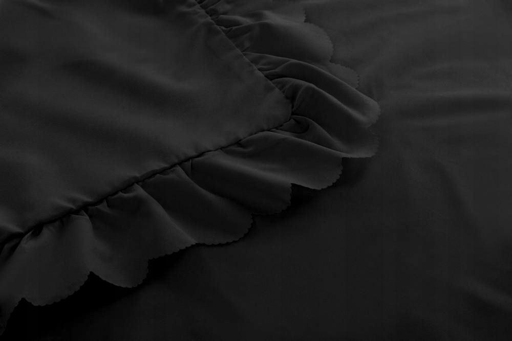 Czerń w sypialni to wybór odważny, ale niezwykle efektowny. Czarna pościel z falbankami Glamour to propozycja dla osób, które chcą wprowadzić do wnętrza nutę luksusu.