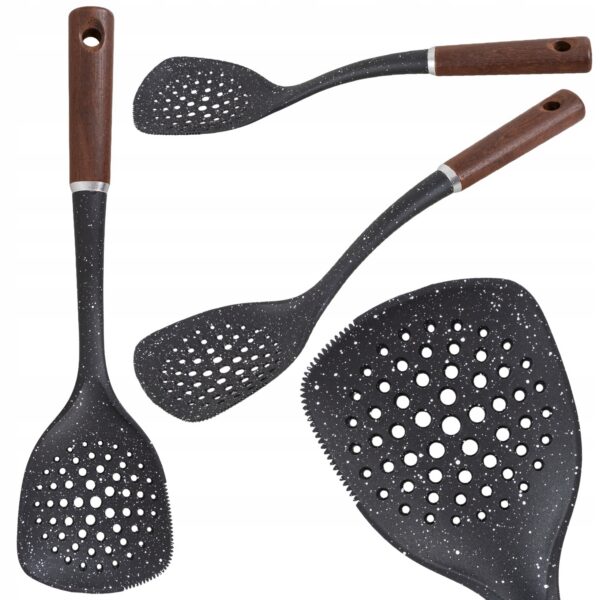 Łopatka kuchenna łączy w sobie naturalne piękno drewna z nowoczesnym wykończeniem z wzorem granitowym, tworząc narzędzie, które nie tylko spełnia funkcje praktyczne, ale również staje się dekoracyjnym elementem Twojej kuchni.