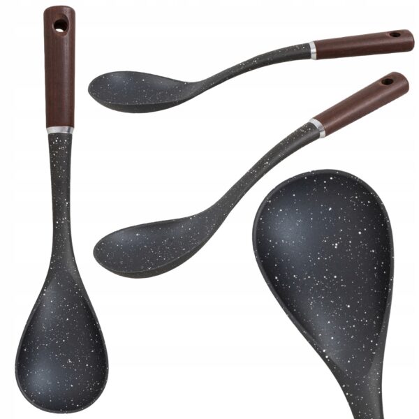 Uchwyt w połączeniu z nowoczesnym, granitowym wzorem, sprawia, że łyżka ta staje się dekoracyjnym elementem kuchni.